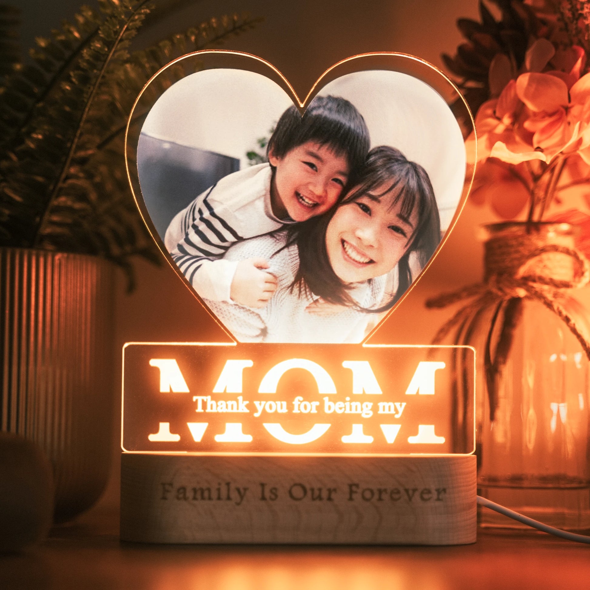 Your photo is carved into acrylic. Your message is engraved into the wood base, and delivered to your door ready to be gifted.